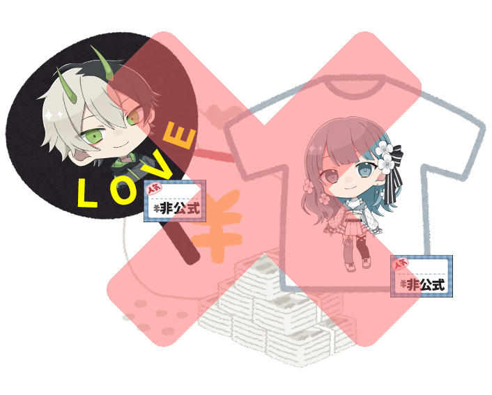 無断でグッズを作成し、販売することは法律で禁止されています。自作グッズの販売はできませんのでご注意ください。ただし、個人の同人誌販売のような、「紙」素材のものであればOKとします!(書店に並ぶ場合はご相談ください!)